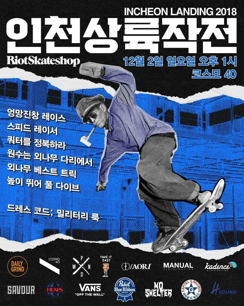 12월 2일 일요일, 라이엇(Riot Skateshop)의 색다른 이벤트 <인천 상륙 작전>이 코스모 40에서 개최되었다. 제일 잘 타는 스케이터만을 선별했던 기존의 대회와는 달리, 타는 재미와 보는 재미를 동시에 느낄 수 있도록 프로그램이 구성되었다.