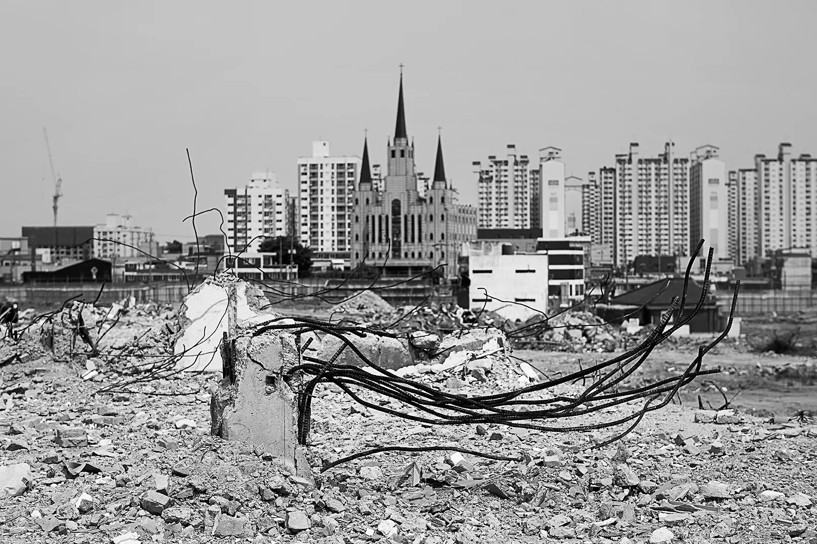 작가 유림은 지나간 시간 속 사라져 버린 그리고 사라져 버릴 마을을 사진으로 기록해왔습니다. 무너진 벽돌과 엉켜있는 철근, 외롭게 서있는 대문 만이 삶의 터전이었던 마을의 시간을 오롯이 남겼습니다. '도시화'라는 이름으로 사라져가는 마을의 시간과 이웃의 기억, 누군가에게 남았을 '흉터'를 이번 개인전에서 그만의 시선으로 보여줍니다.