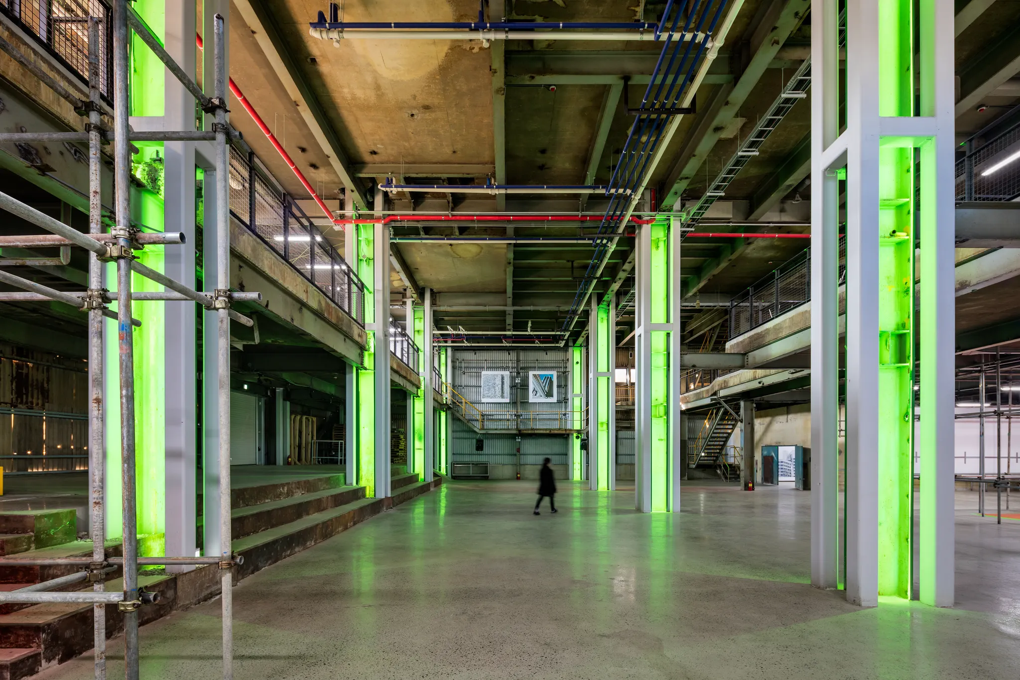 A ground floor with a 10m ceiling height and two mezzanine floors make up the lower level which will host various performances and events. The only new architectural element on the lower level is the column bundles that structurally support the extension. These column bundles also act as thick light columns that dictate and instantly change the ambience of the whole space.