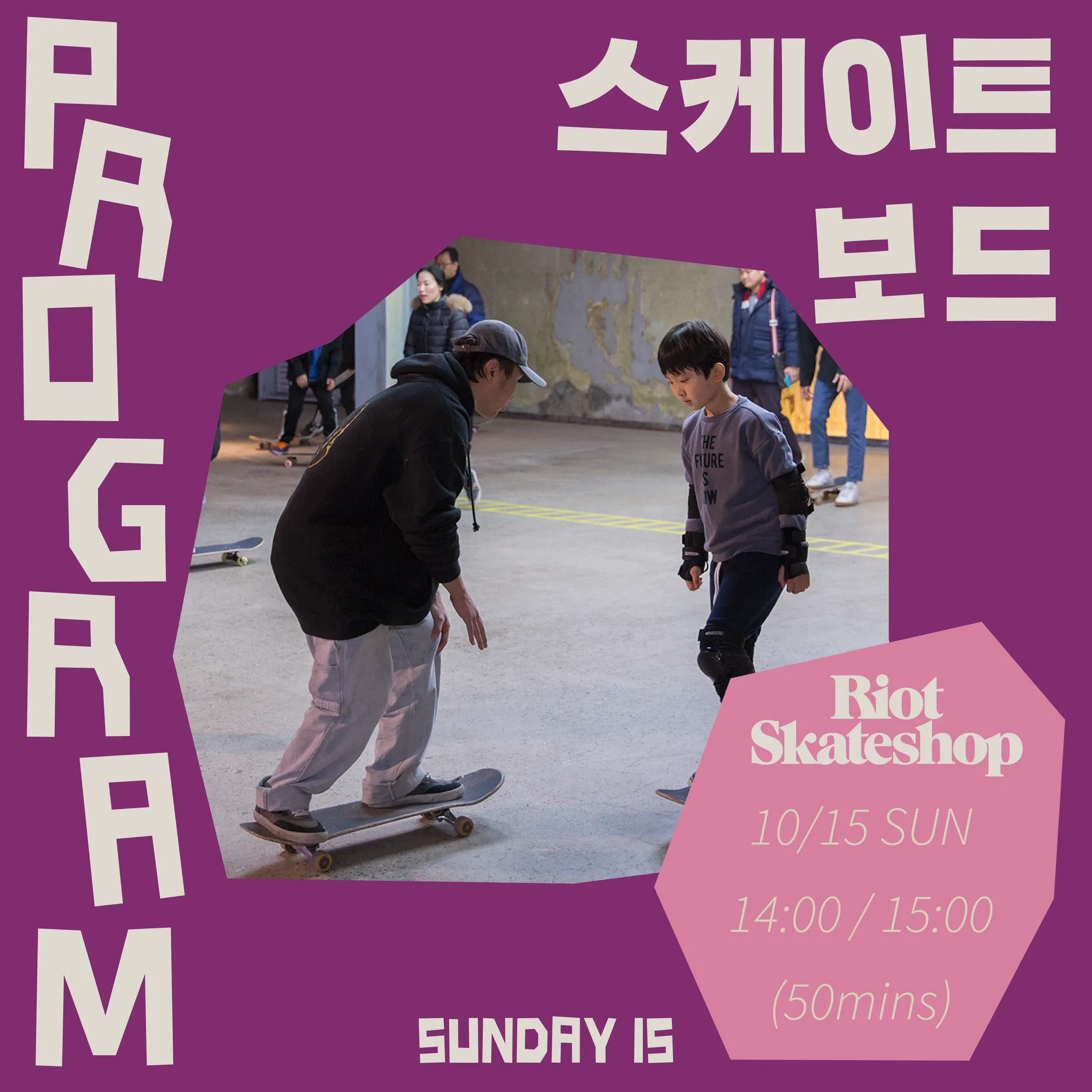 Sunday is 마켓의 프로그램으로 무료 스케이트보드 수업이 열립니다. 평소 스케이트보드에 관심이 많았거나 배울 기회가 없었던 일반인과 초급자를 대상으로 Riot Skateshop (@riot.kr)의 스케이트 팀이 체계적인 스케이트보드 레슨을 진행합니다. 스케이트보드 기초부터 프리라이딩까지 누구나 쉽게 스케이트보드를 즐길 수 있는 프로그램이니 많은 관심 부탁드립니다.