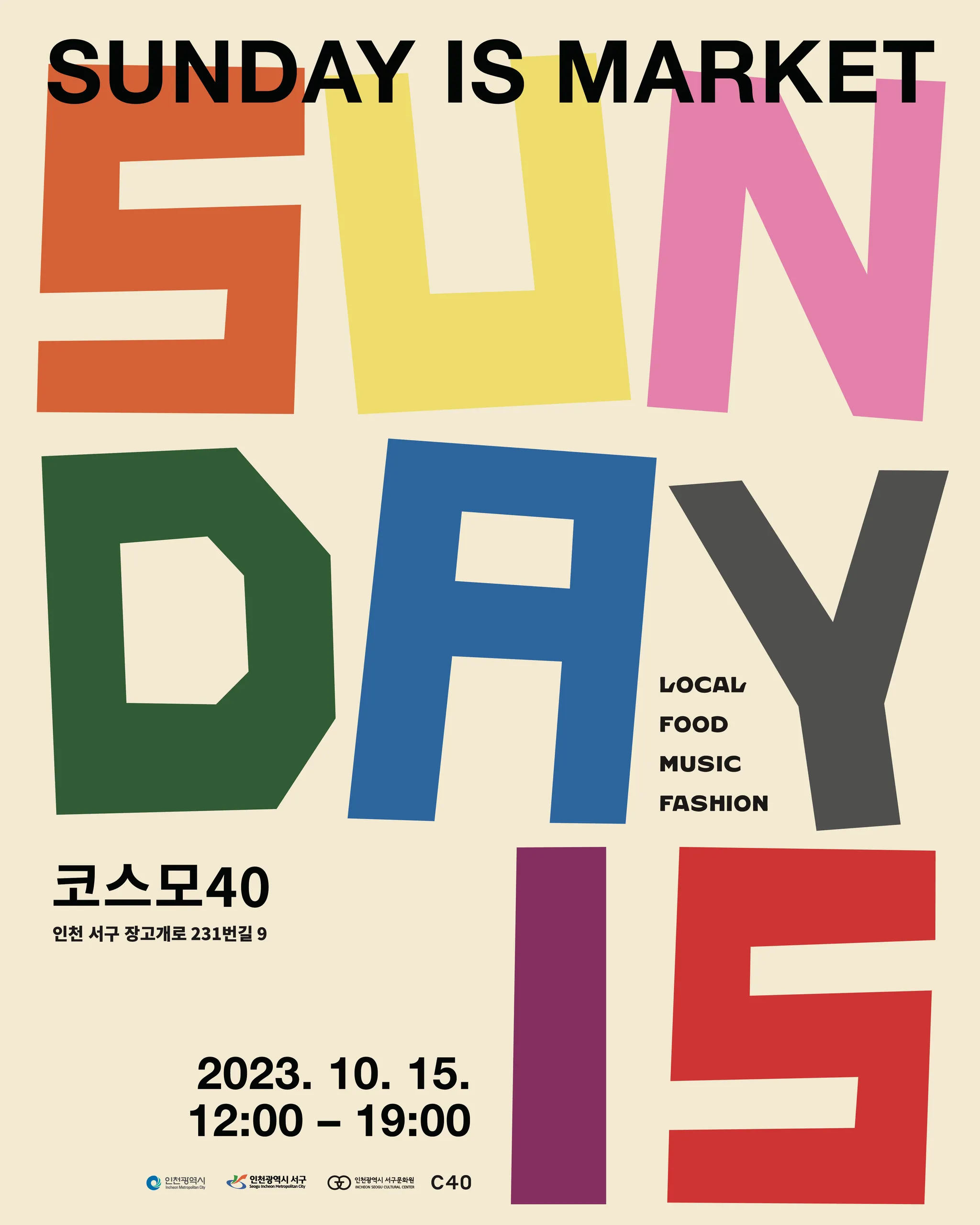 10월 15일, 일요일을 더욱 특별하게 만들어 줄 { Sunday is } 마켓이 개최됩니다. Sunday is는 인천 로컬숍뿐 아니라 다양한 지역의 숍들이 함께하는 마켓으로 의류, 음식, 상품 등을 비롯해 신나는 음악과 톡톡 튀는 프로그램들이 준비됩니다. 단순한 장터를 넘어 여러분의 일요일을 더욱 풍성하고 즐겁게 만들어 줄 다양한 카테고리의 컨텐츠와 함께합니다. 오는 10월 15일 코스모40에서 열리는 Sunday is 마켓에서 다채로운 먹거리와 구경거리, 놀거리를 즐겨 보세요!