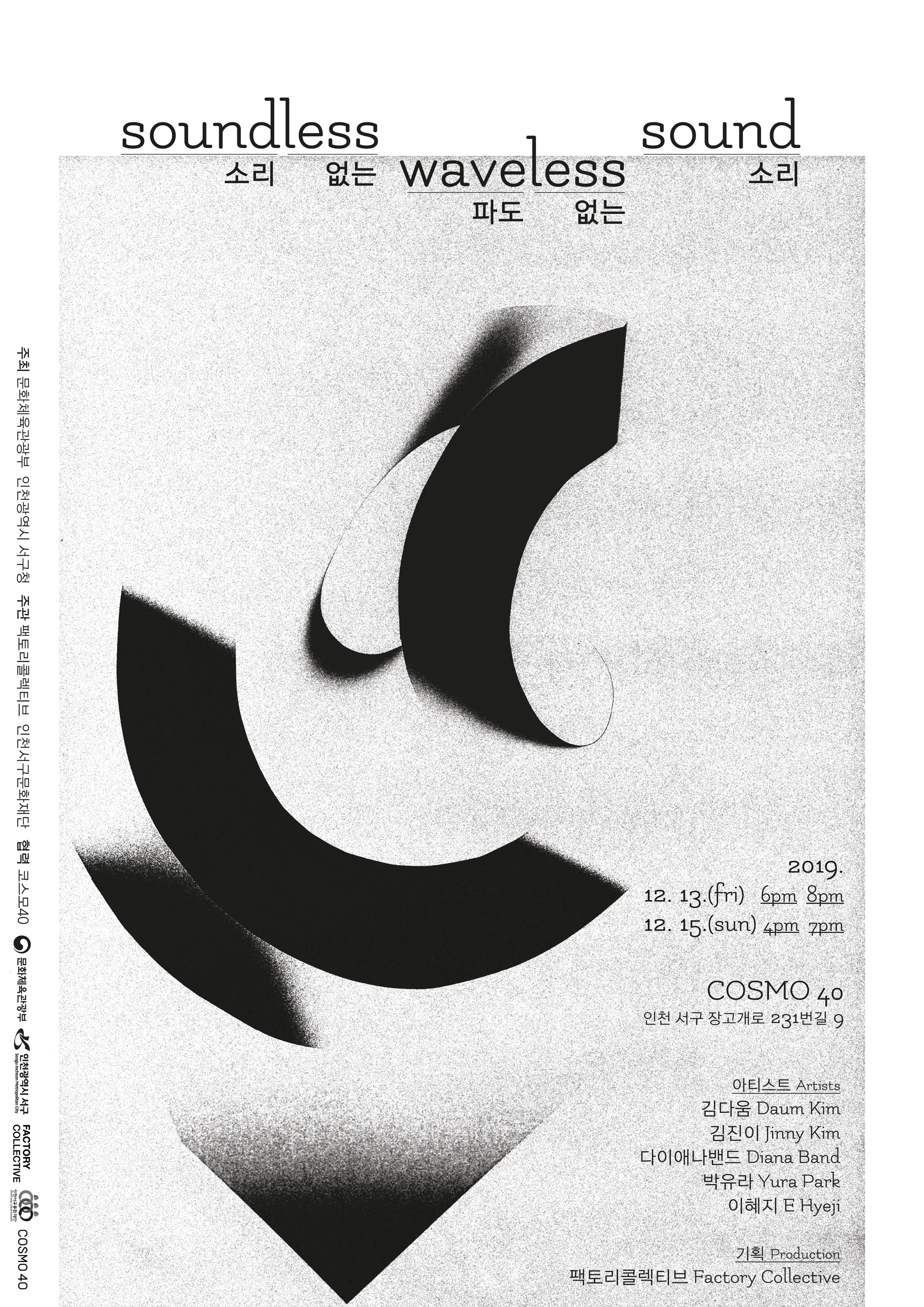 공연 <소리 없는 파도 없는 소리>는 지금은 땅의 모습을 하고 있는 아무도 필요로 하지 않는 바다를 사운드, 무용, 영상을 통해 호출한다. 소리들과 움직임들은 코앞까지 바닷물이 들어왔던 곳을 통과하고 코스모화학의 공장이었던 코스모40을 가로지르며 조수의 시간과 파도의 소리가 쌓여가던 시절을 불러들일 것이다. 그 시절까지 거슬러 올라가는 한 시간 가량의 공연은 땅 이전의 시간에 대한 기록이자 기억이다.