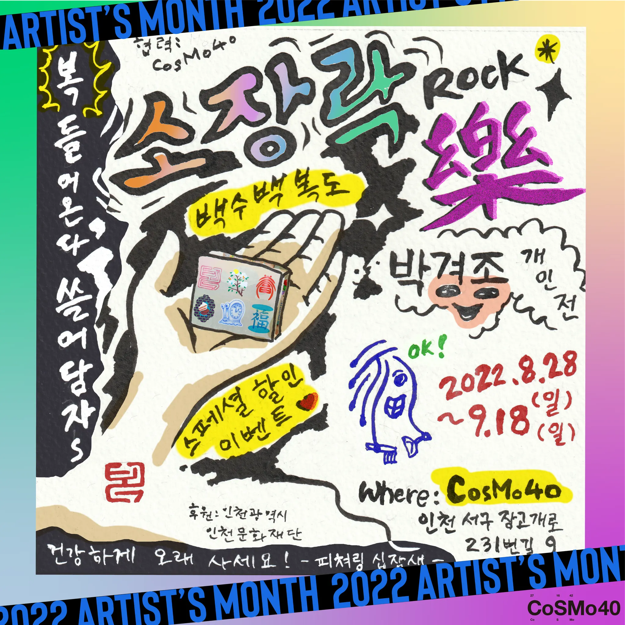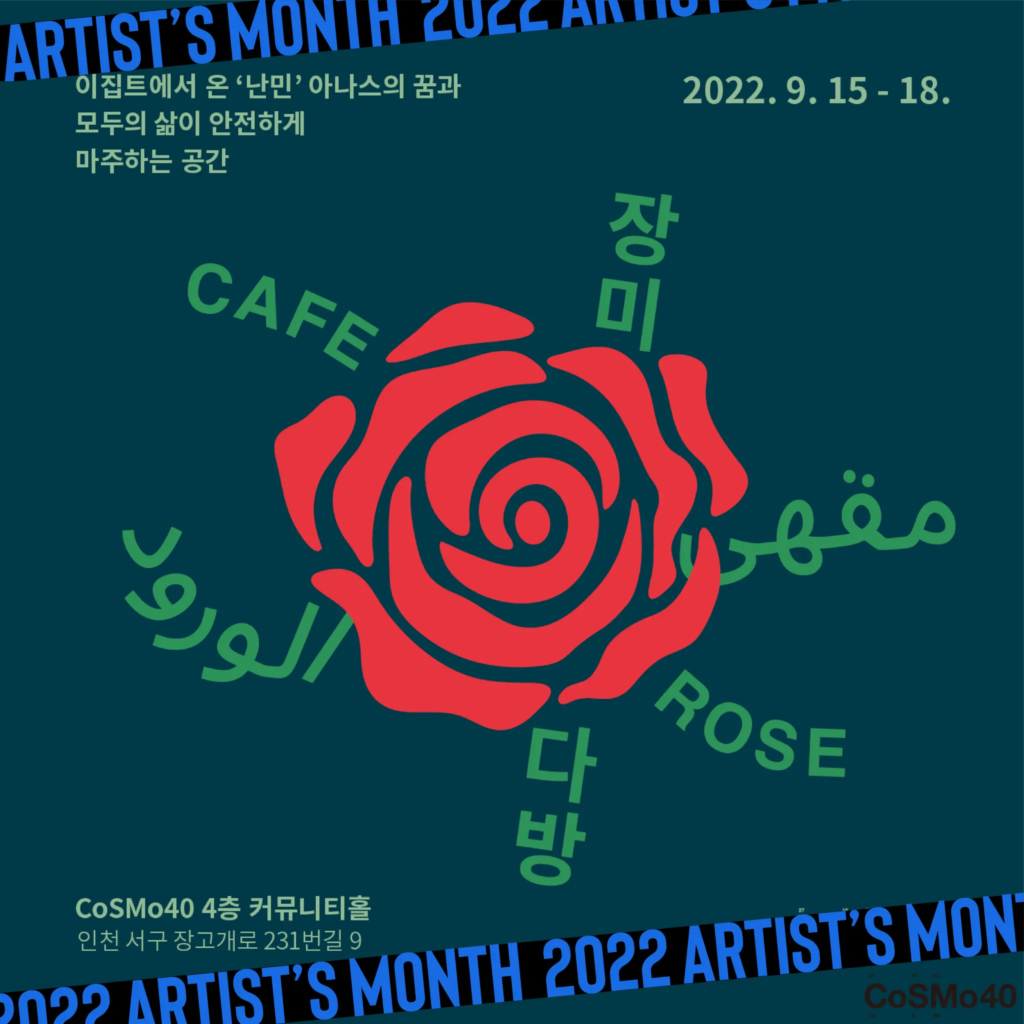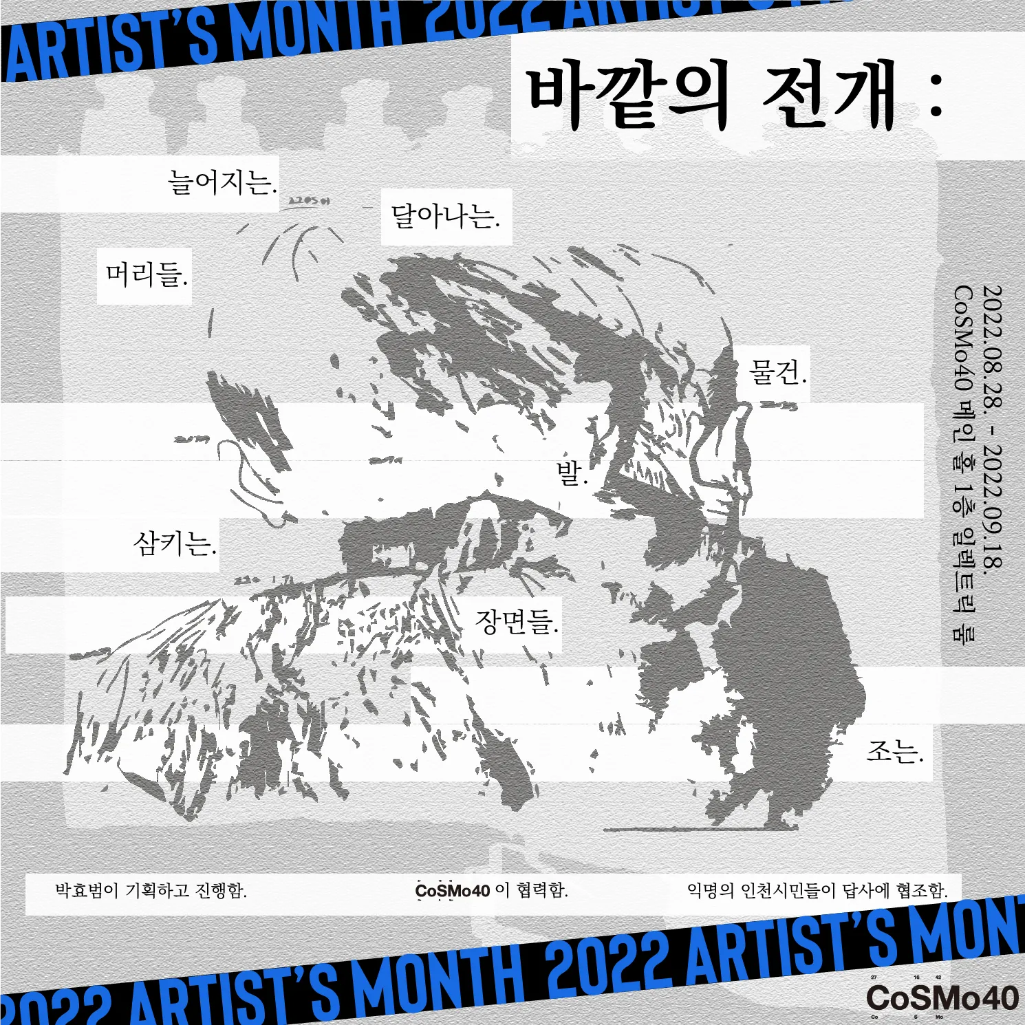 문화예술 불모지로 일컬어지던 인천 가좌동에 위치한 복합문화예술공간 코스모40은 지역 예술가들의 새로운 예술 활동의 장이 되고 있다. 이에 ‘커뮤니티 먼스’라는 이름으로 지역 예술가를 위한 지원 프로그램을 운영해왔다. 올해부터는 예술가에 대한 지원의 성격을 강화하고자 《아티스트 먼스》로 이름을 바꾸며 첫 오픈콜을 진행, 인천 출신이거나 인천에서 활동하거나, 인천에 관련된 프로젝트를 하는 예술가를 모집하였다.