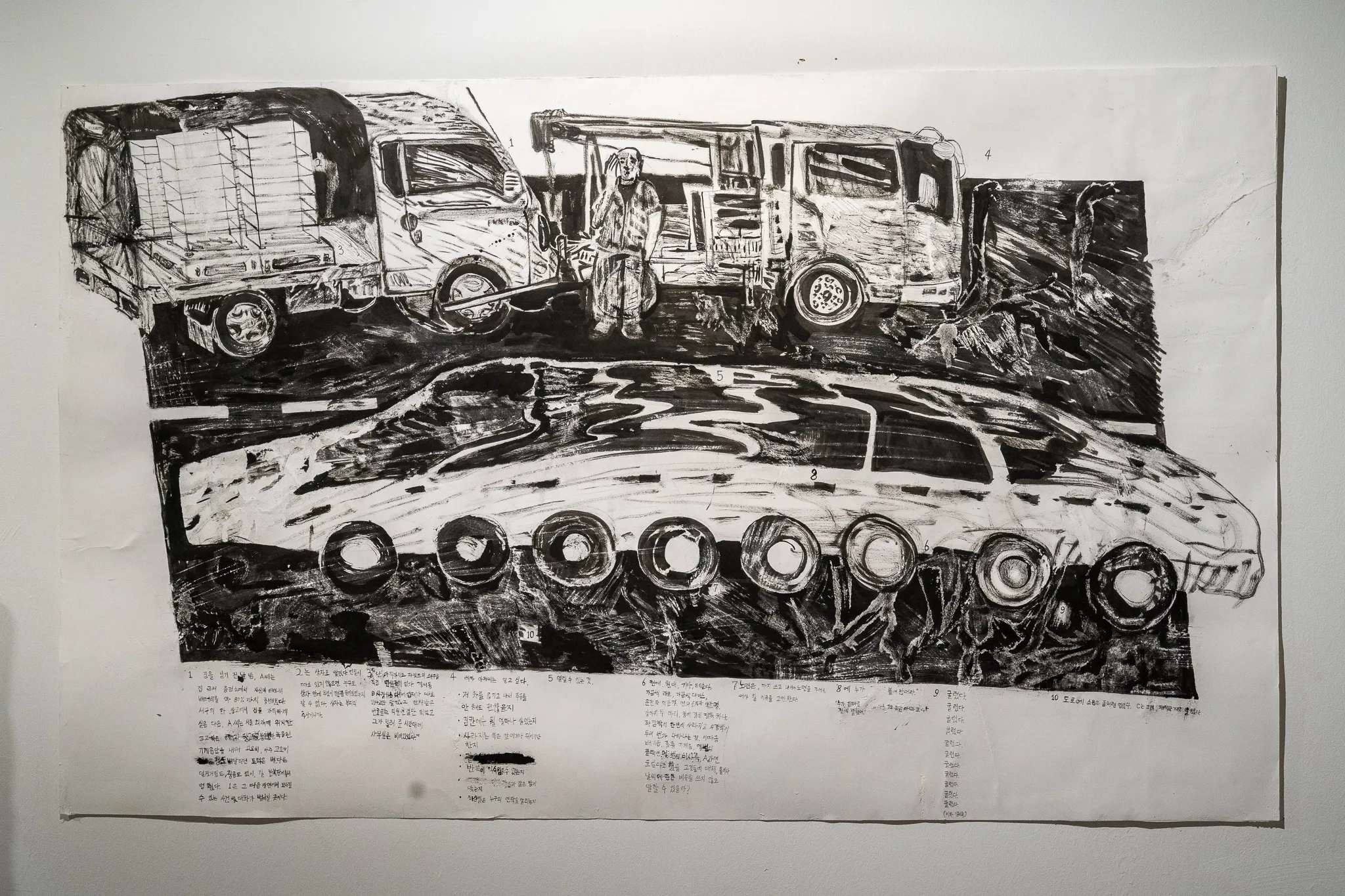 내연기관차에서 전기차로의 전환이 이루어지고 있다는 소식을 알게 된 이후, 나는 인천 지역의 운송업 및 자동차 제조업을 다루는 회화와 에세이 작업을 계획하였다. 그 작업이 논문이나 보도자료, 역사소설 따위의 집필에 비유되기를 바랐다. 더 솔직히 말하자면, 기술 발전의 구호 아래에서 지워지는 노동자의 존재나 자본주의의 모순 같은 것들을 현장에서 관측하고 폭로하는 작업을 하고 싶었다.