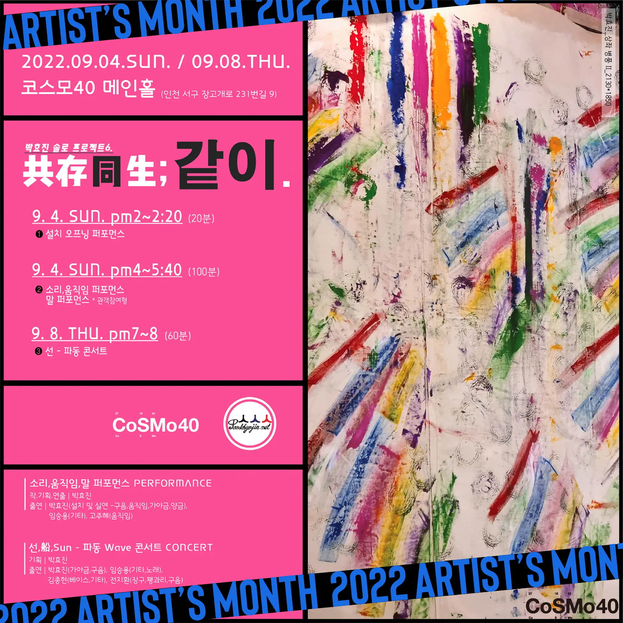이번 2022 Artist's Month를 통해 2회 공연으로 발표되는데, 전통 종합예술의 다양한 범주 안에서 박효진의 동시대적 감성을 담아 공연에 전시가 더해진 퍼포먼스(4일)와 산조와 블루스 장르가 더해져 또 다른 장르의 음악을 선보이는 콘서트(8일)가 열린다.