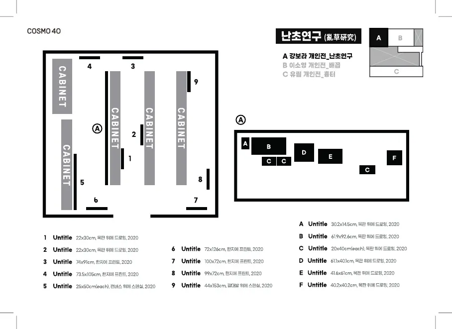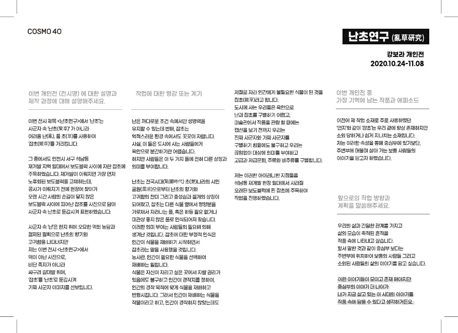강보라 작가는 이번 전시 〈난초연구 亂草硏究〉에서 먹이 아닌 사진으로, 비단 족자가 아니라 싸구려 갈대발 위에, '잡초'를 '난초'로 둔갑시켜 가짜 사군자 이미지를 선보인다.